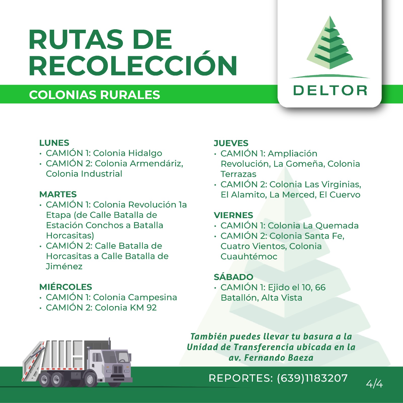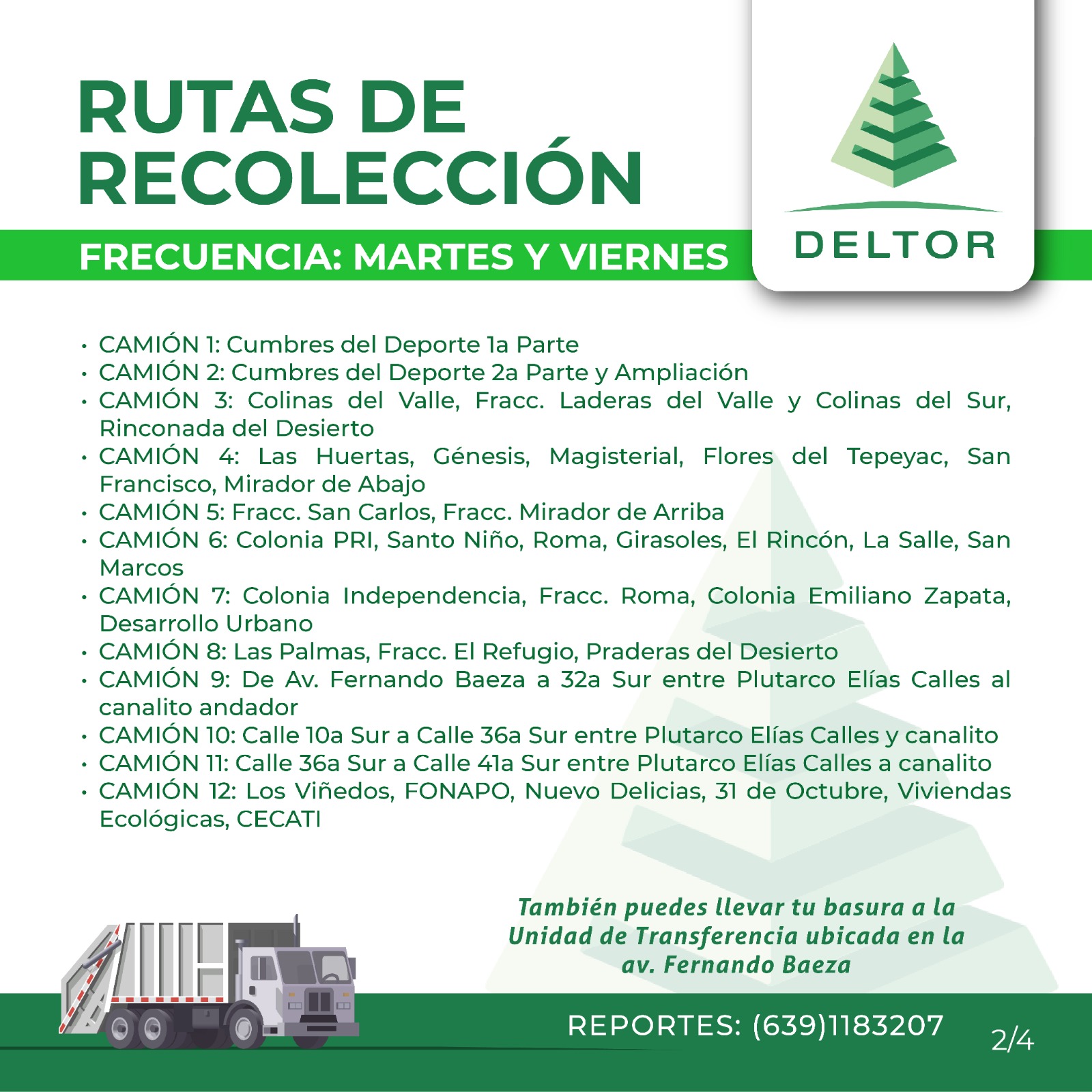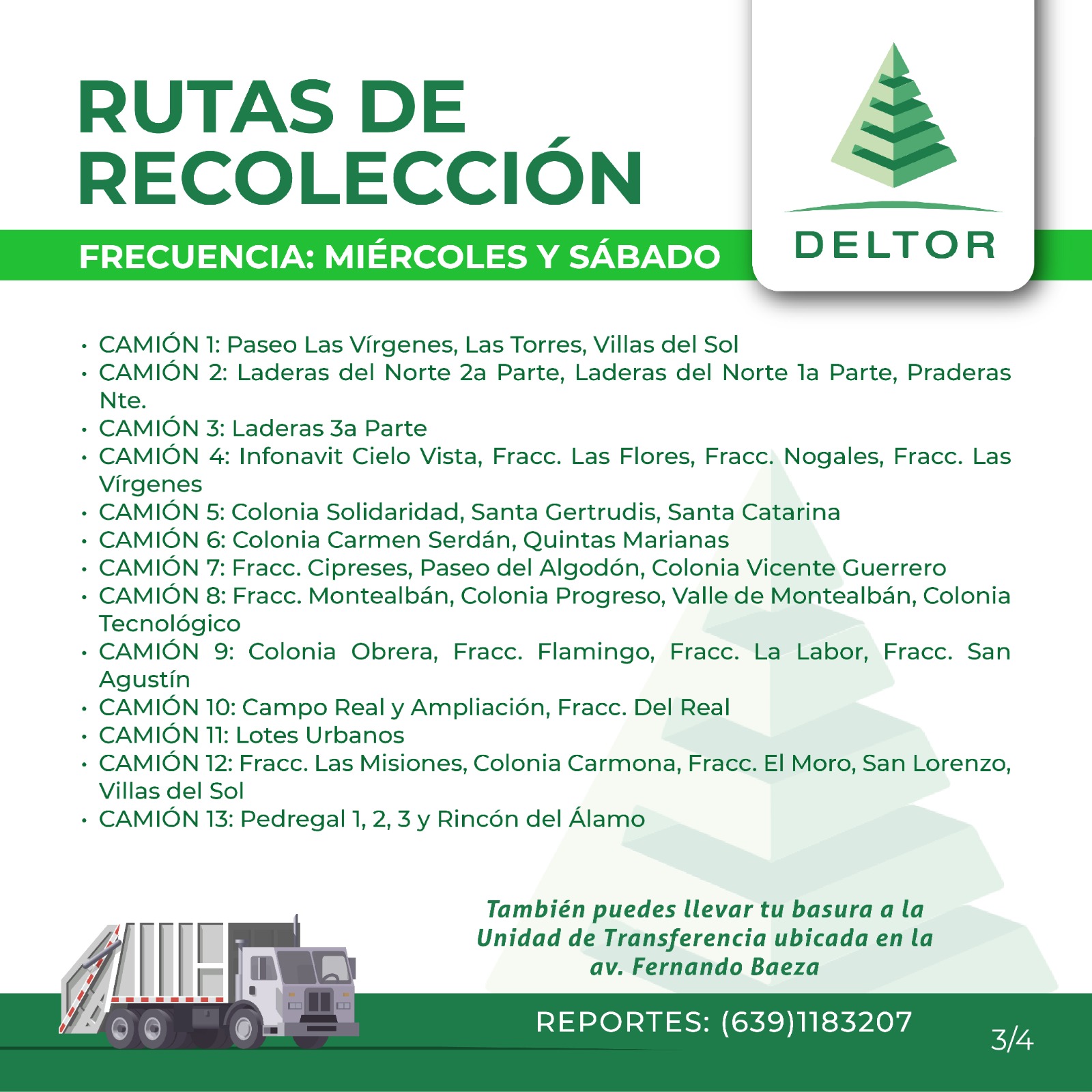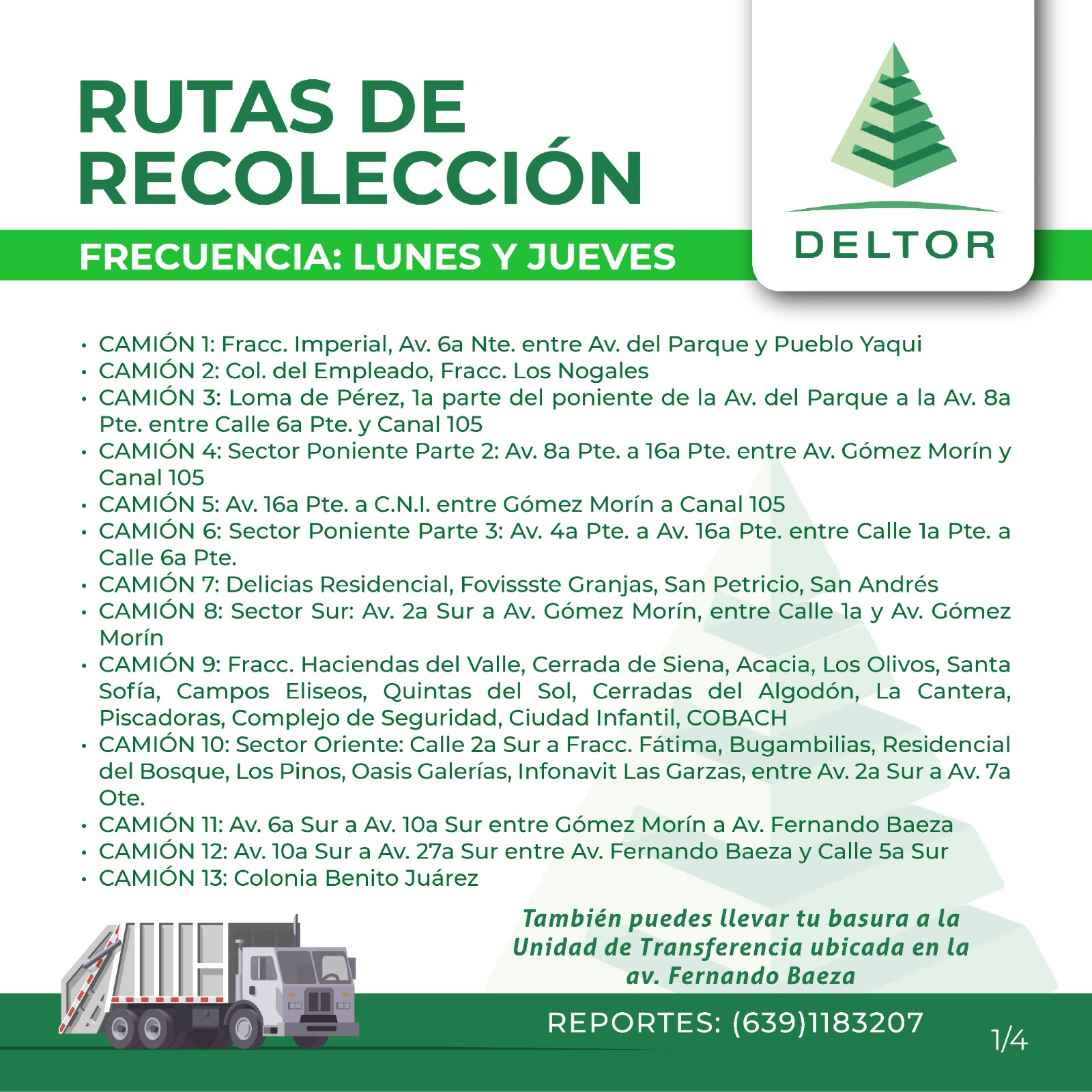 Con el objetivo de mejorar el servicio de recolección de basura, la empresa Deltor anunció a partir de este lunes la puesta en marcha de nuevas rutas de recolección de residuos en la ciudad de Delicias y sus colonias rurales, dividiendo la cobertura por días específicos de la semana y zonas estratégicas.