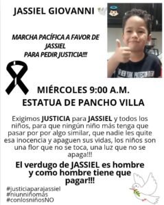 Puede ser una imagen de 1 persona y texto que dice «JASSIEL GIOVANNI PACÍFICAA A FAVOR DE JASSIEL PARA PEDIR ARAPEDIRJUSTICIA!!! JUSTICIA!!! 8 MIÉRCOLES 9:00 A.M. ESTATUA DE PANCHO VILLA ONEN YORK PROTECTORBEM Exigimos JUSTICIA para JASSIEL y todos los niños, para que ningún niño más tenga que pasar por por algo similar, que nadie les quite esa inocencia y apaguen sus vidas, los niños son una flor que no se toca, una luz que no se apaga!!! EI verdugo de JASSIEL es hombre y como hombre tiene que pagar!!! #justiciaparajassiel #niunninomas #conlosniñosNO».