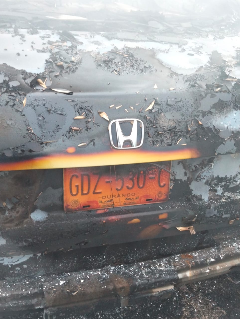De inmediato, los elementos se trasladaron al lugar indicado, donde pudieron constatar la presencia de un automóvil de la marca Honda, línea Accord, modelo 2004, con placas de circulación del estado de Durango, el cual se encontraba completamente calcinado, sin personas en su interior.