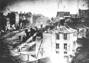 En 1838, se tomó la que se cree que es la primera fotografía en la que aparecen personas. La imagen muestra una figura humana en el Bulevar del Temple parisino, pero debido al largo tiempo de exposición para llegar a impresionar la imagen –más de diez minutos– no se pueden ver ni el tráfico ni los otros transeúntes ya que se mueven demasiado rápido. Las imágenes que sí quedaron reflejadas en la foto fueron las de un hombre y un chiquillo que limpiaba sus botas, los cuales permanecieron en la misma postura durante todo el tiempo que duró la exposición.