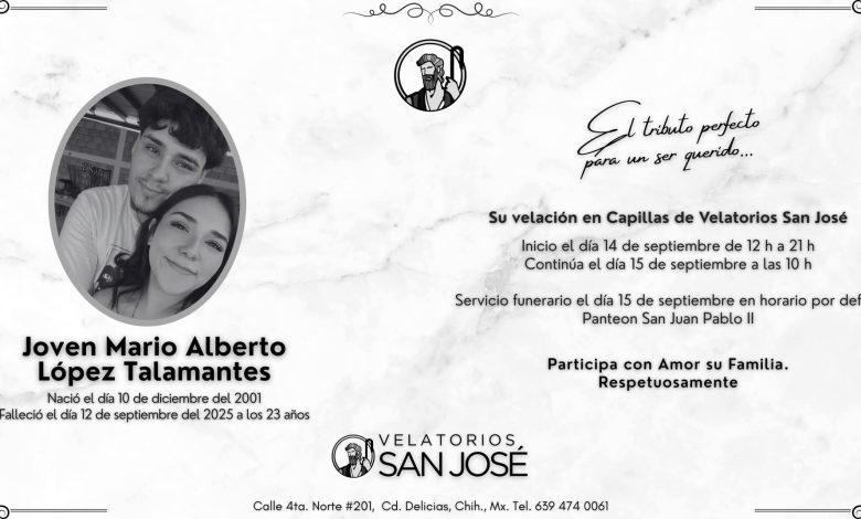 De acuerdo con la información difundida, la velación se lleva a cabo en el Velatorio San José, ubicado en calle Cuarta Norte número 101 de Delicias, Chihuahua, con un horario de 12:00 a 21:00 horas, permitiendo que allegados y conocidos se acerquen a despedirse y acompañar a sus seres queridos en este difícil momento.
