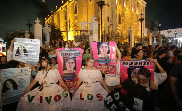 Con fotografías en alto y vestidos intervenidos con mensajes de memoria, familiares y amigos de víctimas irrumpieron en la celebración con un grito distinto: “¡Vivos los desaparecidos!”. Sus voces, amplificadas por megáfonos, contrastaron con los fuegos artificiales y la algarabía, recordando que miles de personas siguen sin ser localizadas en la entidad.