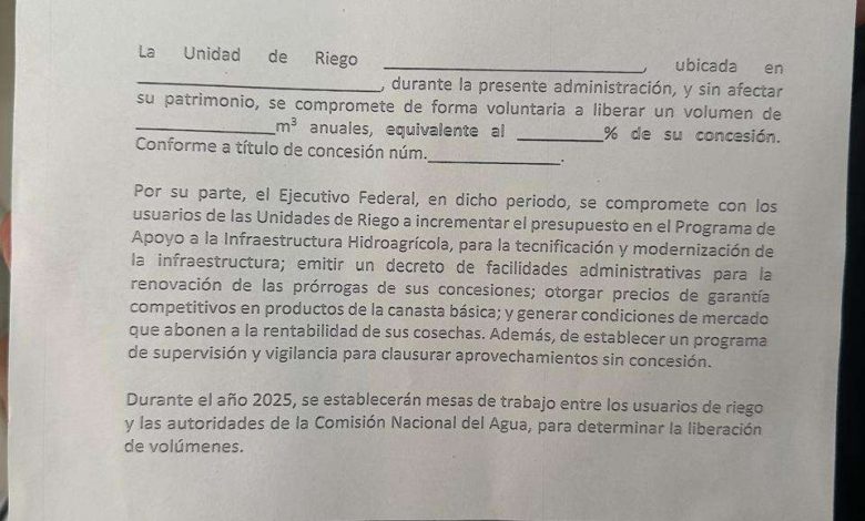 Chihuahua.— Productores agrícolas del estado abandonaron una reunión con la Comisión Nacional del Agua (CONAGUA) tras rechazar la propuesta de ceder un 10% del agua concesionada como parte del “Acuerdo Nacional por el Derecho Humano al Agua”.