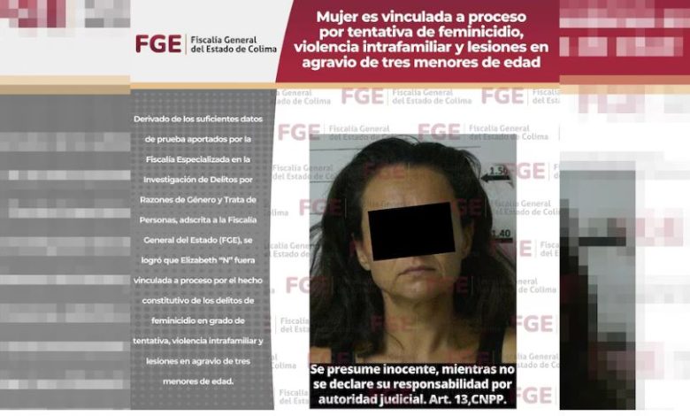 De acuerdo con la Fiscalía General de Colima (FGEC), Elizabeth “N” fue vinculada a proceso por tentativa de feminicidio y violencia intrafamiliar tras presuntamente intentar incendiar a tres niñas luego de haberlas rociado con una sustancia derivada del petróleo. Los hechos ocurrieron dentro de una casa ubicada en la colonia Leandro Valle, en Villa de Álvarez.