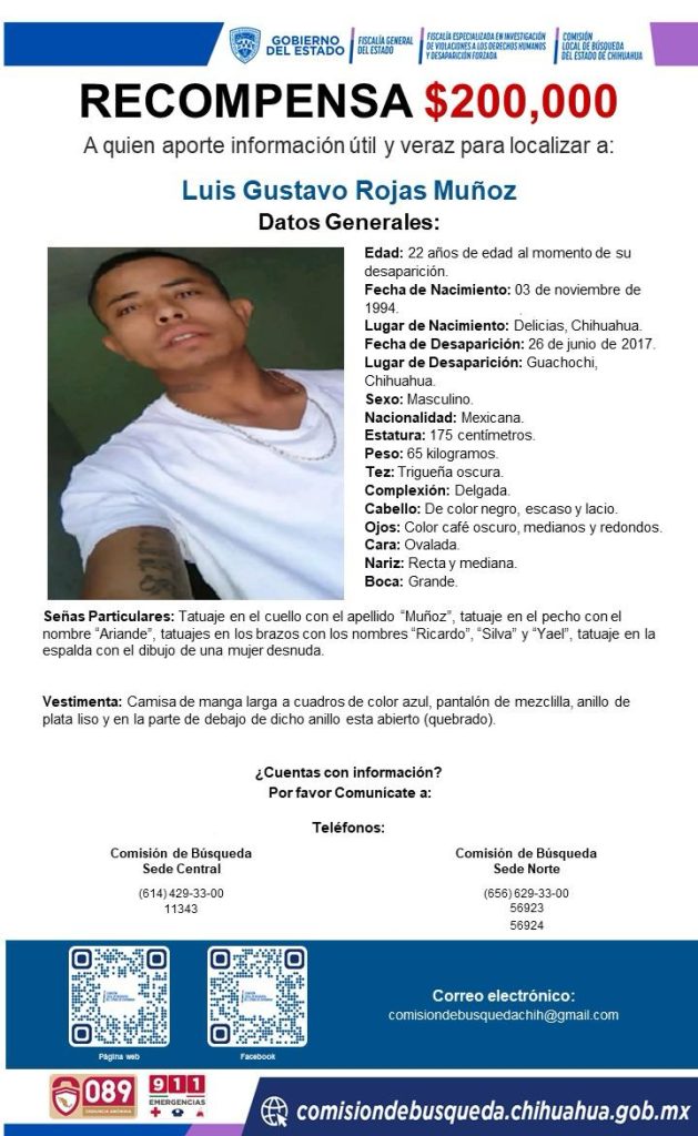 En seguimiento a la búsqueda de los delicienses Luis Enrique Barraza Muñoz y Luis Gustavo Rojas Muñoz, desaparecidos desde 2017 en el municipio de Huachochi, la Fiscalía General del Estado ofreció una recompensa de 200 mil pesos a quien aporte información útil y veraz que permita dar con su paradero.