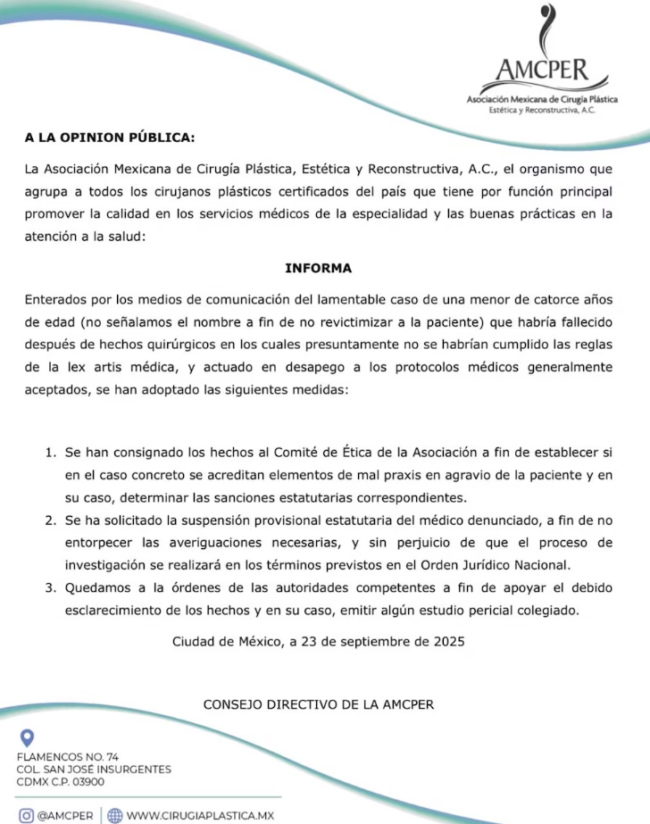 El comunicado, emitido la noche del martes 23 de septiembre y firmado por el Consejo Directivo de la AMCPER, organismo que agrupa a los cirujanos plásticos certificados en México, expuso que, ante la información difundida del caso, se ha remitió los hechos a su Comité de Ética.