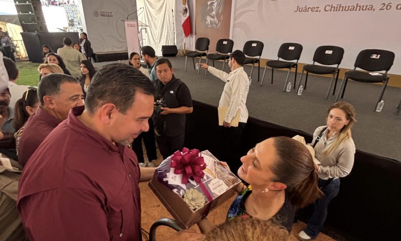 Ciudad Juárez.- El Presidente Municipal de Juárez, Cruz Pérez Cuéllar, hizo entrega a la presidenta de México, Claudia Sheinbaum Pardo, un conjunto de obsequios elaborados con dedicación y profundo significado por mujeres funcionarias indígenas de nuestra ciudad.
