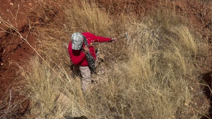 Una de las mujeres inserta la varilla en la excavación, la saca y huele la punta que entró a lo profundo de la tierra, el olor es fuerte y desagradable. La experiencia le dicta que ahí puede haber un cuerpo enterrado.