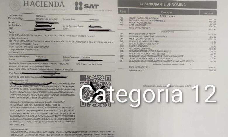• – Categoría 12: El salario total de percepción es de $10,059.41 pesos; tras descuentos similares a los de la categoría 13, el importe neto queda en $7,093.42 pesos. En caso de que el trabajador recurra a préstamos con el ISSSTE o FONACOT para emergencias, su sueldo quincenal puede reducirse a poco más de $5,000 pesos.