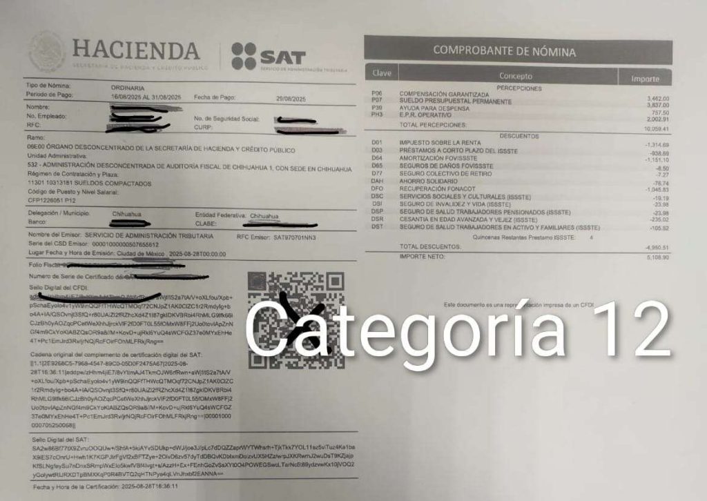 • – Categoría 12: El salario total de percepción es de $10,059.41 pesos; tras descuentos similares a los de la categoría 13, el importe neto queda en $7,093.42 pesos. En caso de que el trabajador recurra a préstamos con el ISSSTE o FONACOT para emergencias, su sueldo quincenal puede reducirse a poco más de $5,000 pesos.
