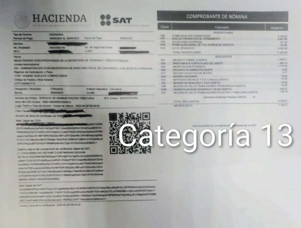 • – Categoría 13: Un trabajador con esta categoría obtiene una percepción neta quincenal de $8,038.40 pesos después de impuestos y aportaciones, equivalente a $4,019.20 pesos por semana. Sin embargo, al contar con un descuento por un préstamo a corto plazo del ISSSTE, el ingreso neto se reduce a $7,136.27 pesos quincenales ($3,526.13 semanales).