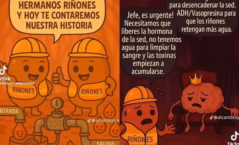 Publicado en la cuenta de @gerardcristofer444, pero creado por cuentas educativas como @karenetchegoyen, el clip narra una historia aparentemente inocente que pronto se transforma en una potente advertencia médica. En ella, los riñones son retratados como dos hermanos inseparables, responsables de filtrar toxinas y mantener el equilibrio de líquidos en el cuerpo. Todo marcha bien, hasta que la falta de agua empieza a debilitar a uno de ellos, forzando al otro a asumir toda la carga… hasta colapsar.