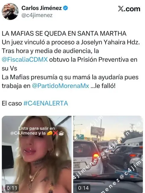 El periodista Carlos Jiménez informó que, tras hora y media de audiencia, la Fiscalía General de Justicia capitalina obtuvo la prisión preventiva en contra de Joselyn Yahaira ‘N’, popular en TikTok, pero también envuelta en la polémica.