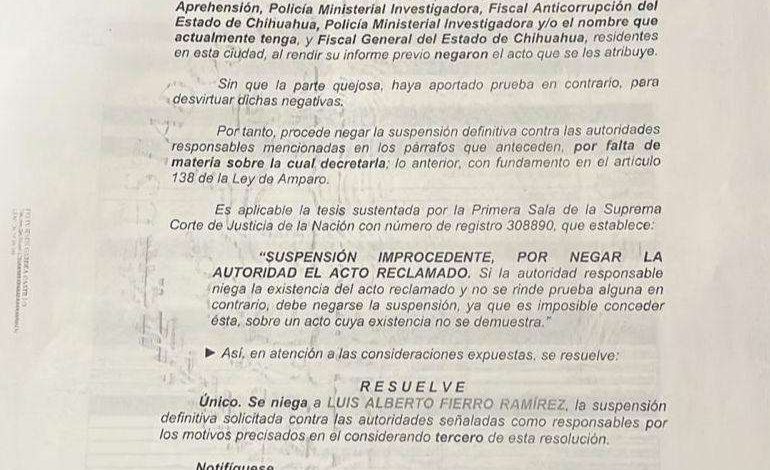 Chihuahua.- El exrector de la UACH, Luis Alberto Fierro Ramírez, recibió un revés judicial por novena ocasión, luego de que el Juzgado Segundo de Distrito en el Estado de Chihuahua rechazara el juicio de amparo promovido en su intento por frenar posibles acciones penales en su contra.