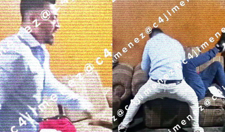 En otro clip, se observa cómo un sujeto con camisa azul y pantalón blanco golpea brutalmente a un hombre recostado en un sofá, a quien lanza al suelo y patea en el rostro mientras le grita: