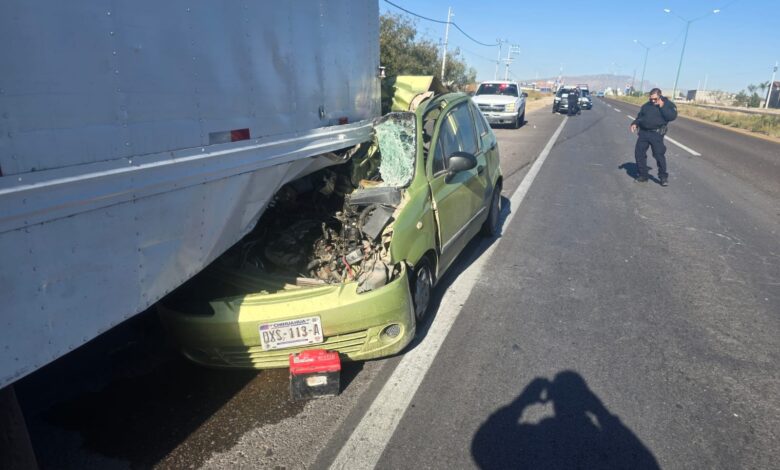 Un joven de tan solo 33 años de edad resultó milagrosamente ileso tras protagonizar un aparatoso accidente en el que su vehículo Matiz terminó prácticamente destruido al impactar contra un camión de mudanzas con número económico 05, en color blanco, de la marca Dina modelo 1998, sobre la carretera federal a la altura del municipio de Meoqui.