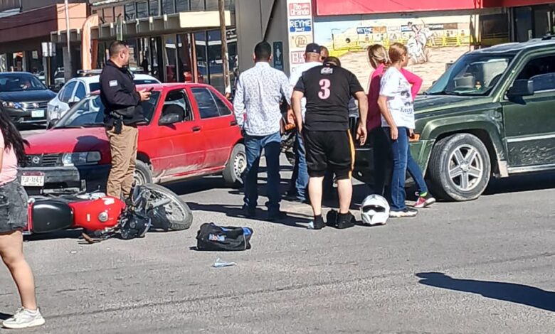Un motociclista resultó lesionado luego de registrarse un percance vial en el cruce de la avenida Primera y la calle Primera Norte, en el primer cuadro de la ciudad, justamente en contra esquina de Parquímetros, en donde participaron una motocicleta y una camioneta Jeep Patriot en color verde.