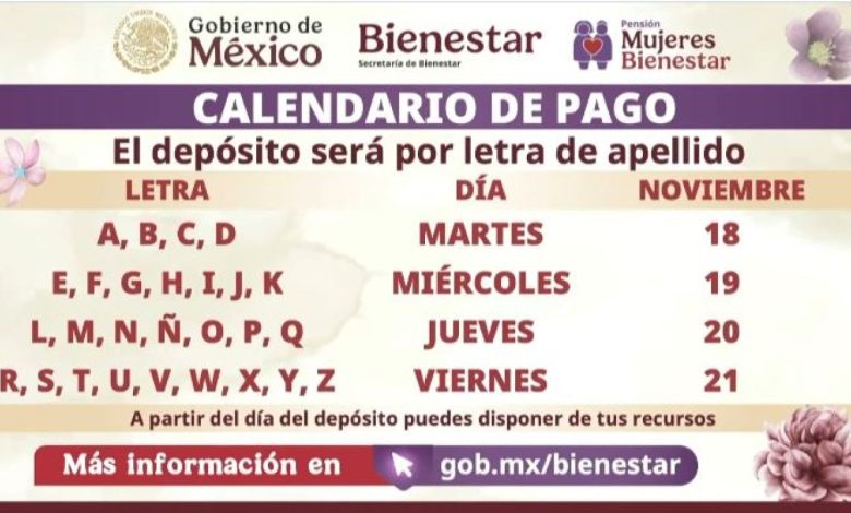 Como pasa con la Pensión del Bienestar, para ordenar los pagos se toma en cuenta la letra inicial del apellido paterno de los beneficiarios. El calendario de pagos para la Pensión Mujeres Bienestar queda así:Apellidos con A, B, C, D: Martes 18 de noviembre.