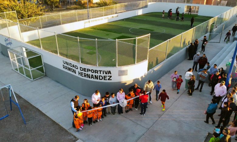 Meoqui.- La alcaldesa Miriam Soto encabezó la inauguración de la rehabilitación de la Unidad Deportiva Ramón Hernández, ubicada en el seccional de Lázaro Cárdenas, siendo parte del Presupuesto Participativo, la cual fue nombrada en honor a un destacado habitante del seccional.