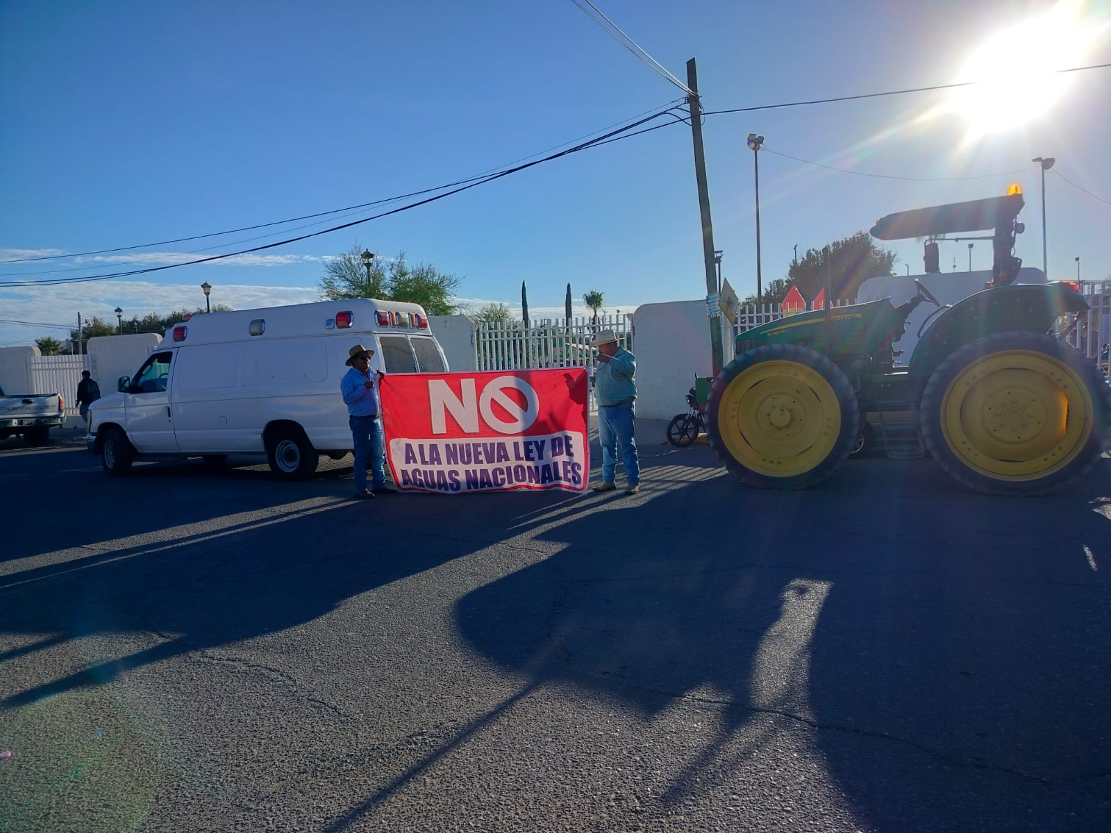 Durante la posada navideña organizada por Morena en la Macroplaza del sector sur de Delicias, un grupo de personas que se identificaron como agricultores se manifestó en el exterior del recinto. Colocaron lonas en rechazo a la nueva Ley de Aguas Nacionales y, aunque no confirmaron su identidad ni representación oficial, permanecieron en el perímetro mientras el evento continuaba en el interior.