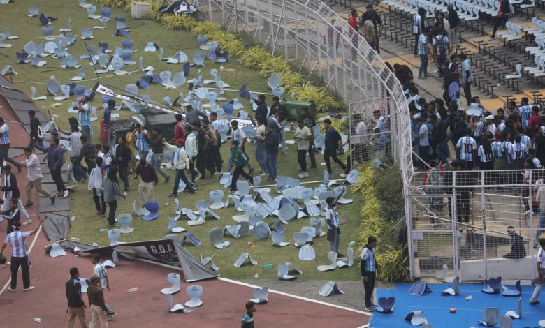 Police detained the chief organiser of Lionel Messi’s India tour after fans ripped up seats, threw objects and invaded the pitch at Kolkata’s Salt Lake Stadium when the football star made only a brief appearance at a ticketed event.