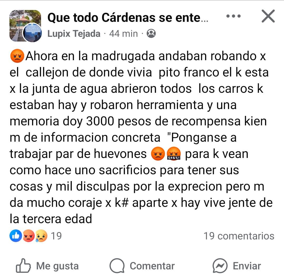 En la misma publicación, el afectado expresó su molestia de manera directa al señalar: “Pónganse a trabajar huevones, para que vean cómo hace uno sacrificios para tener sus cosas”, agregando que, aunque ofreció disculpas por la expresión, el coraje y la impotencia son grandes ante este tipo de delitos.