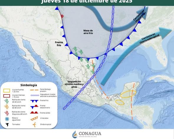 Para este jueves, un frente frío que se aproxima a la frontera norte y noreste de México, en interacción con la corriente en chorro subtropical, una vaguada en niveles altos de la atmósfera, un canal de baja presión y el ingreso de humedad procedente del océano Pacífico, favorecerán ambiente de muy frío a frío por la mañana y de templado a cálido por la tarde.
