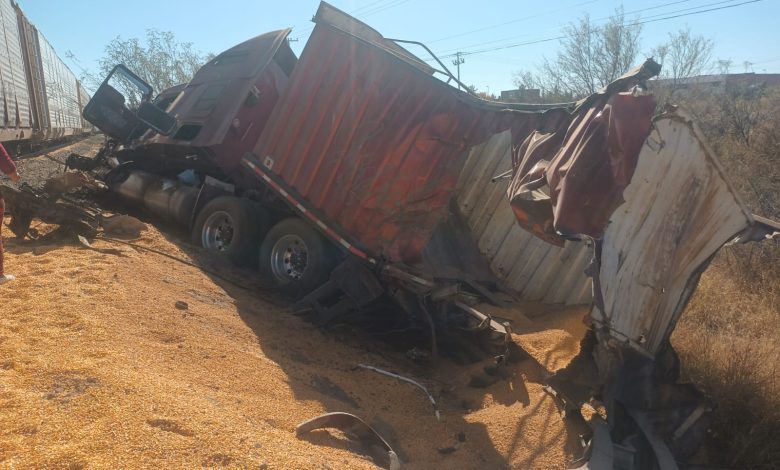 El percance ocurrió en las inmediaciones de la colonia Parque Industrial, donde el tráiler tipo quinta rueda fue alcanzado por la máquina férrea, provocando severos daños y dejando al conductor con heridas de gravedad.