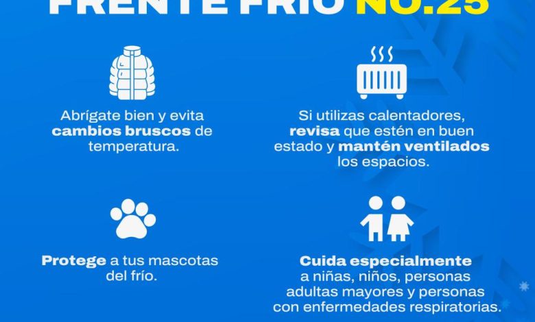 Asimismo, exhortó a la población a abrigarse adecuadamente y evitar cambios bruscos de temperatura, así como a poner especial atención en niñas, niños, personas adultas mayores y personas con enfermedades respiratorias. En caso de utilizar calentadores o calentones, recomendó verificar que se encuentren en buen estado y mantener ventilados los espacios, a fin de prevenir riesgos por acumulación de gases.