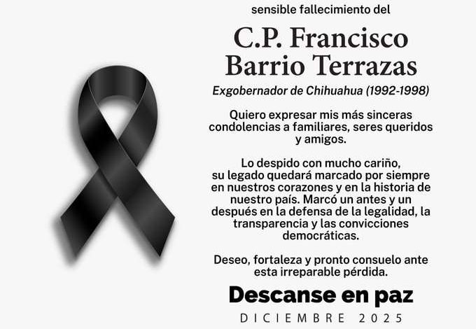 La gobernadora del estado, María Eugenia Campos Galván, lamentó el fallecimiento de Francisco Barrio Terrazas, exgobernador de Chihuahua, a través de un mensaje difundido en sus redes sociales, donde expresó su respeto y condolencias a la familia y seres queridos del exmandatario.