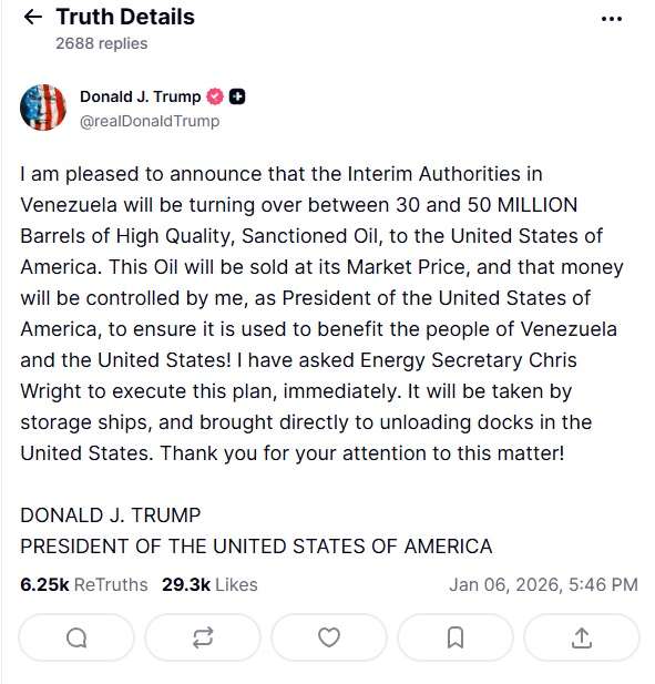 «Me complace anunciar que las autoridades interinas de Venezuela entregarán entre 30 y 50 millones de barriles de petróleo de alta calidad y sancionado a los Estados Unidos de América».