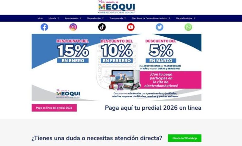 Con el objetivo de facilitar los trámites y brindar mayor comodidad a las y los contribuyentes, el Gobierno Municipal de Meoqui puso en marcha la modalidad de pago en línea del impuesto predial, a través del portal oficial www.meoqui.com.mx, donde podrán realizar este trámite desde la comodidad de su hogar, evitando filas y respetando los descuentos por pronto pago.