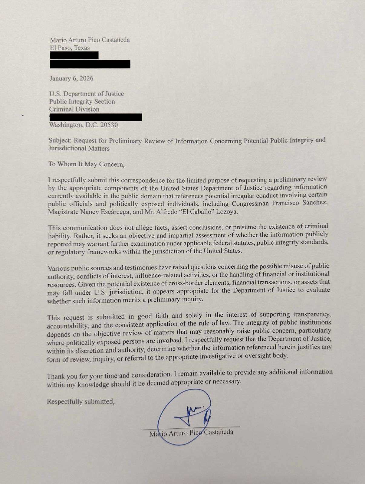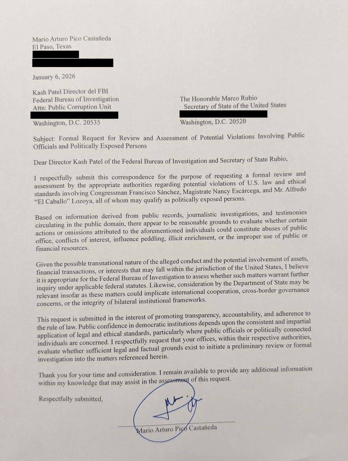 A través de publicaciones realizadas en sus redes sociales, Pico Castañeda señaló que durante el encuentro expresó su preocupación por la presunta actuación de diversos actores políticos y judiciales del estado de Chihuahua, cuyas conductas —dijo— podrían afectar la confianza ciudadana, el ejercicio adecuado de la función pública y el manejo responsable de los recursos públicos.