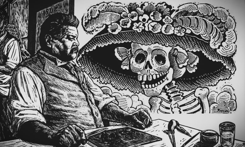 Fue en ese ejercicio periodístico donde nacieron sus calaveras, figuras que hoy parecen folclor inmóvil pero que entonces eran comentario político. Esqueletos vestidos de gala, de campesinos, de soldados: la muerte como igualadora social y como editorial. La más célebre, la Calavera Garbancera —que después Diego Rivera bautizaría como “La Catrina”—, no era un adorno: era una crítica a la aspiración vacía, al olvido de las raíces, al maquillaje de la pobreza. Posada no dibujaba para el museo; dibujaba para el día siguiente.