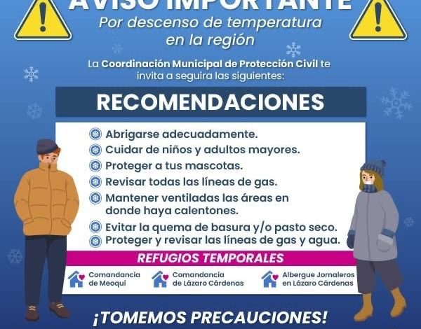 El coordinador de Protección Civil y Bomberos de Meoqui, Eduardo Guillén, informó que durante el fin de semana se esperan ráfagas de viento de hasta 70 km/h, así como temperaturas mínimas que podrían descender hasta los 2 grados centígrados el próximo lunes, por lo que exhortó a la población a extremar precauciones; abrigarse adecuadamente, no dormir con los calentones encendidos, revisar que no existan fugas de gas utilizando agua y jabón, no colocar tanques de gas dentro del domicilio, usar reguladores y mangueras certificadas, mantener una ventilación de al menos 10 a 15 centímetros, y evitar que niñas y niños se acerquen a los calefactores y a mantenerse informada a través de los canales oficiales.