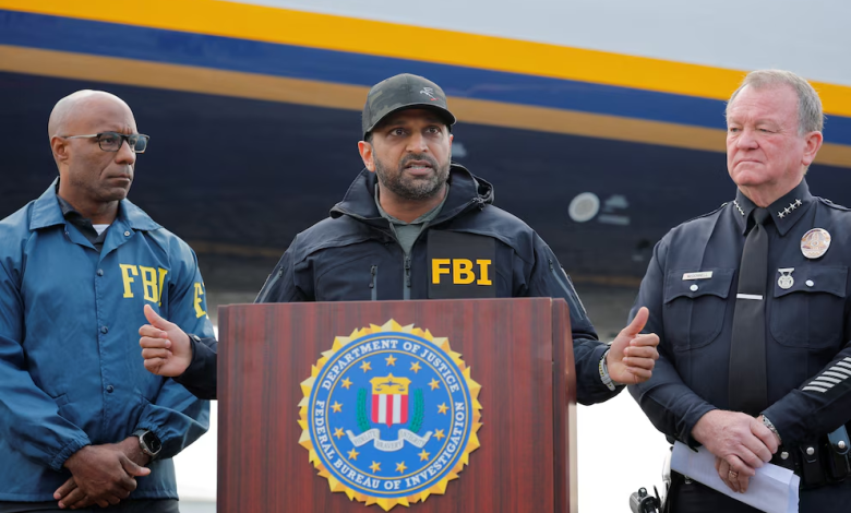 El director del FBI, Kash Patel, anuncia la detención de Ryan Wedding, un ex snowboarder olímpico canadiense que figuraba en la lista de los diez fugitivos más buscados del FBI, mientras Akil Davis, subdirector a cargo de la oficina de campo del FBI en Los Ángeles, está a su lado durante una conferencia de prensa en Ontario, California, EE. UU., el 23 de enero de 2026.