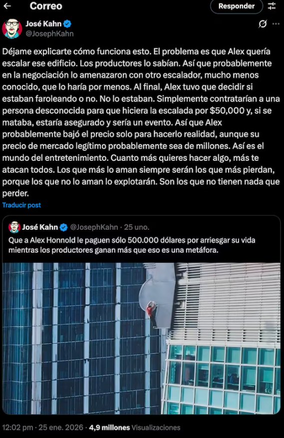 Kahn señaló directamente Netflix pagó a Alex Honnold 500 mil dólares por arriesgar su vida mientras que la plataforma gana considerablemente más dinero que eso.