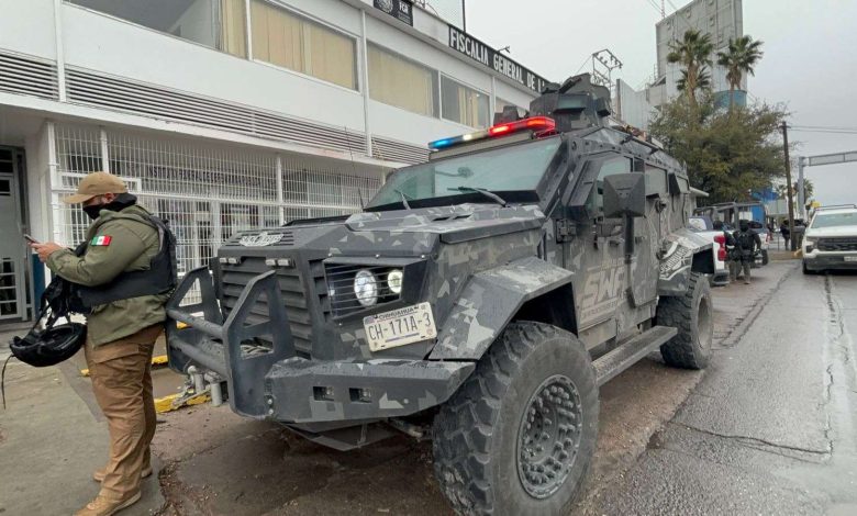 Chihuahua.– Un intenso operativo de seguridad se desplegó al exterior de las instalaciones de la Fiscalía General de la República (FGR), ubicadas sobre la avenida Universidad, con motivo de la presentación de cuatro personas detenidas en el municipio de Guachochi.