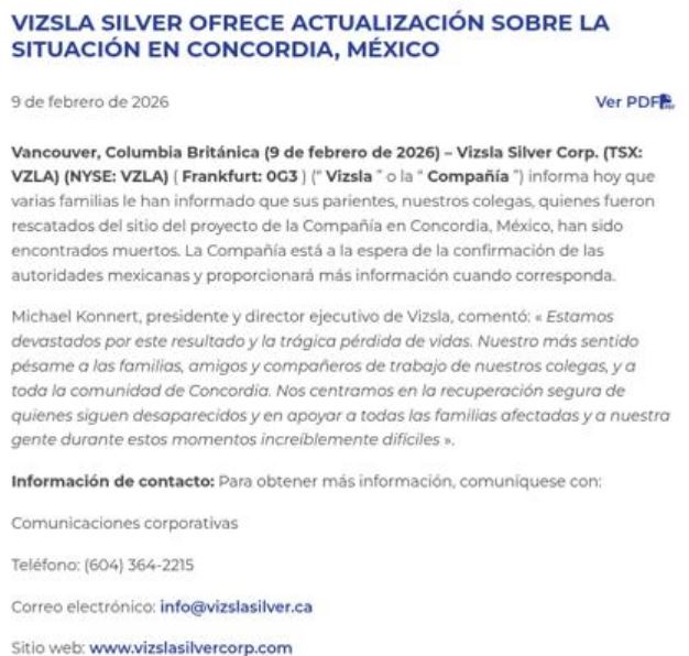 “Estamos devastados por este resultado y por la trágica pérdida de vidas. Expresamos nuestro más sentido pésame a las familias, amigos y compañeros de trabajo de nuestros colegas, así como a toda la comunidad de Concordia”, manifestó Michael Konnert, presidente y director ejecutivo de Vizsla Silver Corp. Asimismo, señaló que la empresa continúa enfocada en la localización de las personas que aún permanecen desaparecidas y en brindar apoyo a las familias afectadas por esta tragedia.