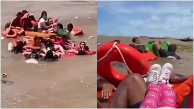 Un video que circula en plataformas digitales muestra la embarcación dividida, mientras algunos adultos cargan a niños en brazos y esperan la llegada de otra nave que acudió al rescate.