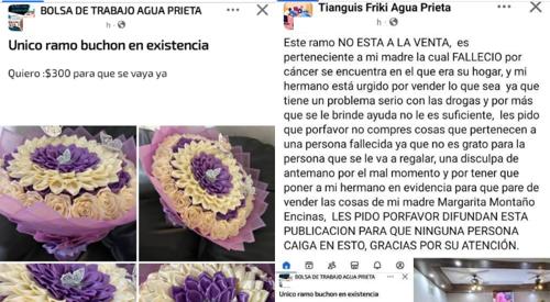 «Este ramo no está a la venta. Pertenece a mi madre, Margarita Montaño Encinas, quien falleció por cáncer. Mi hermano tiene un problema serio con las drogas y, aunque ha recibido ayuda, no le ha sido suficiente. Les pido que por favor no compren cosas que pertenecen a una persona fallecida. Lamento tener que exponer a mi hermano para detener la venta de las pertenencias de nuestra madre. Por favor, difundan esta publicación para evitar que otros caigan en esto.»