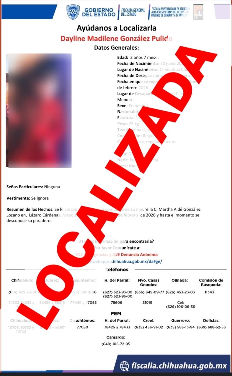 El hallazgo se registró en la colonia Lázaro Cárdenas, dentro del municipio de Meoqui, lugar donde agentes investigadores lograron dar con el paradero de la madre y la menor. Cabe destacar que, aunque habían sido vistas por última vez el pasado 04 de febrero, el reporte oficial de ausencia fue presentado por sus familiares apenas la tarde-noche de ayer, 23 de febrero, en la capital del estado.