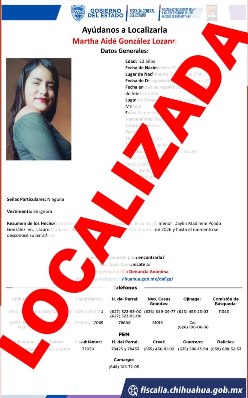 Meoqui.- En una respuesta inmediata y efectiva por parte de las autoridades, la Fiscalía Especializada en Atención a Mujeres Víctimas del Delito por Razones de Género y a la Familia (FEM) confirmó la localización de Martha Aidé G. L., de 22 años, y su hija D.M.G.P., de tan solo 2 años de edad. Ambas contaban con un reporte de ausencia interpuesto recientemente, lo que activó una intensa colaboración ministerial entre Chihuahua y Meoqui.