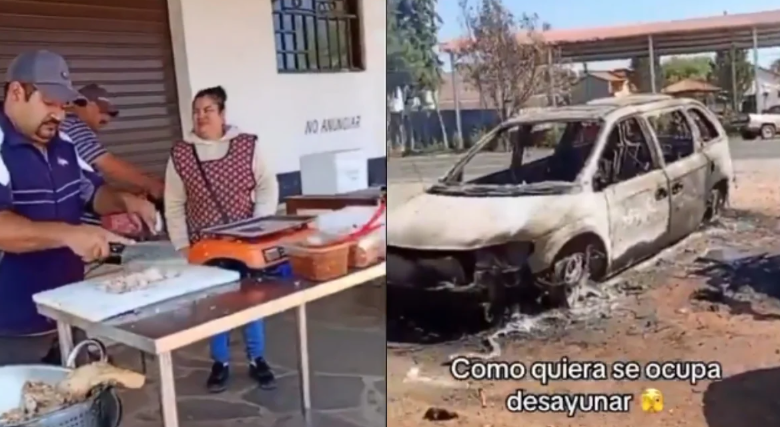 Un video difundido en redes sociales muestra a un vendedor de carnitas que mantuvo su puesto en operación, pese a que a escasa distancia se observaban vehículos incendiados, presuntamente derivados de hechos violentos vinculados al crimen organizado.