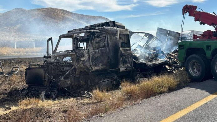Un tractocamión cargado con cartón quedó totalmente calcinado tras chocar con otro en el km 189 de la carretera Delicias-Chihuahua, sin dejar heridos.