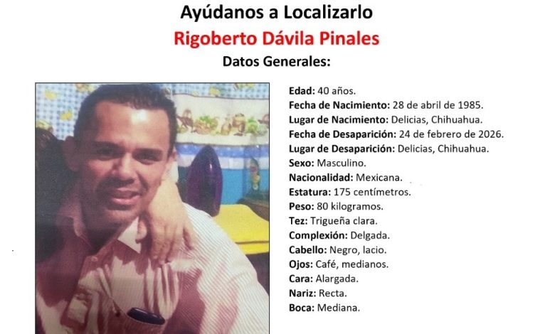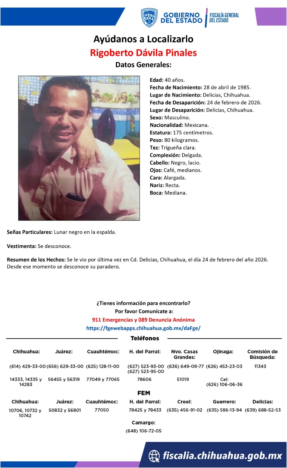 Autoridades de la Fiscalía General del Estado de Chihuahua emitieron una ficha de búsqueda para localizar a Roberto Dávila, quien fue reportado como desaparecido en Delicias desde el pasado 24 de febrero.